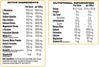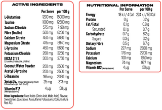 L-Glutamine, Taurine, Sodium Chloride, Fibre (Inulin), Magnesium Citrate, Calcium Citrate, L-Tyrosine, IBCAA 2:1:1 (L-Leucine, L-Isoleucine, L-Valine), Potassium Chloride, Coconut Water Powder, Acetyl L-Tyrosine, L-Theanine, Senactiv® (Panax Notoginseng (Root) & Rosa Roxburghii Tratt (Fruit)), Vitamin B12 (Methylcobalamin).